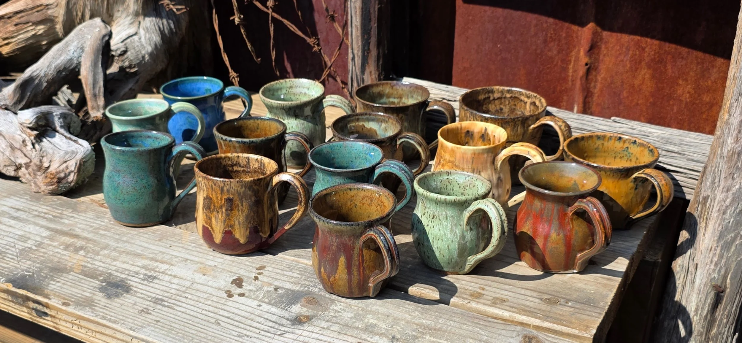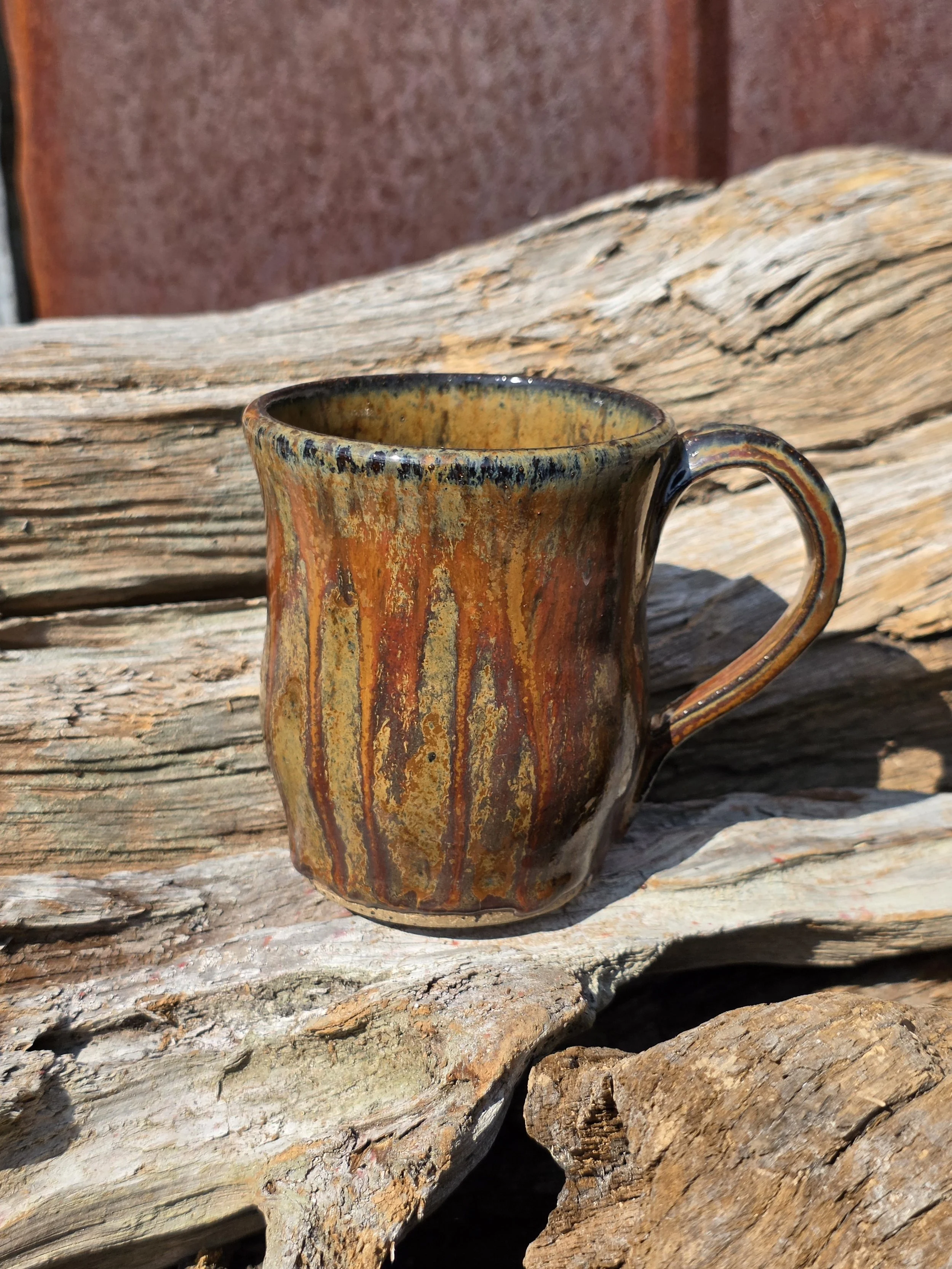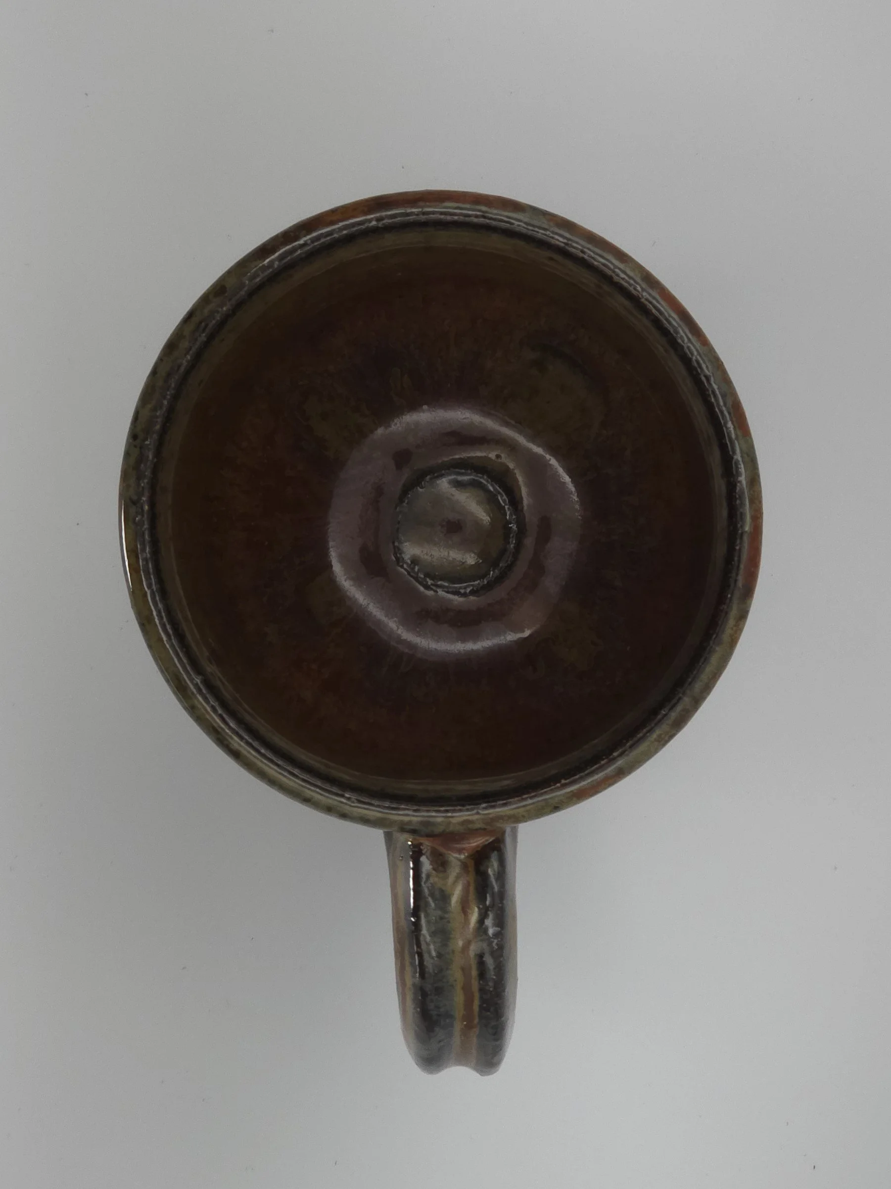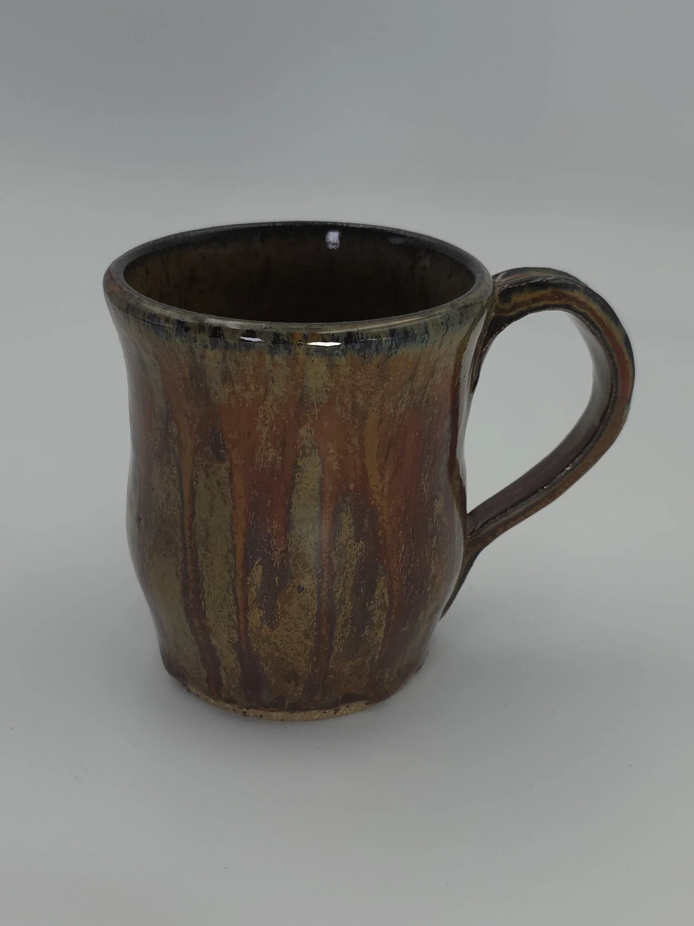 Made of speckled clay with green/brown gloss glaze with copper runs. Holds approximately 12 ounces. 4 inches tall and 3 inches inside diameter at the rim. Microwave and food-safe.