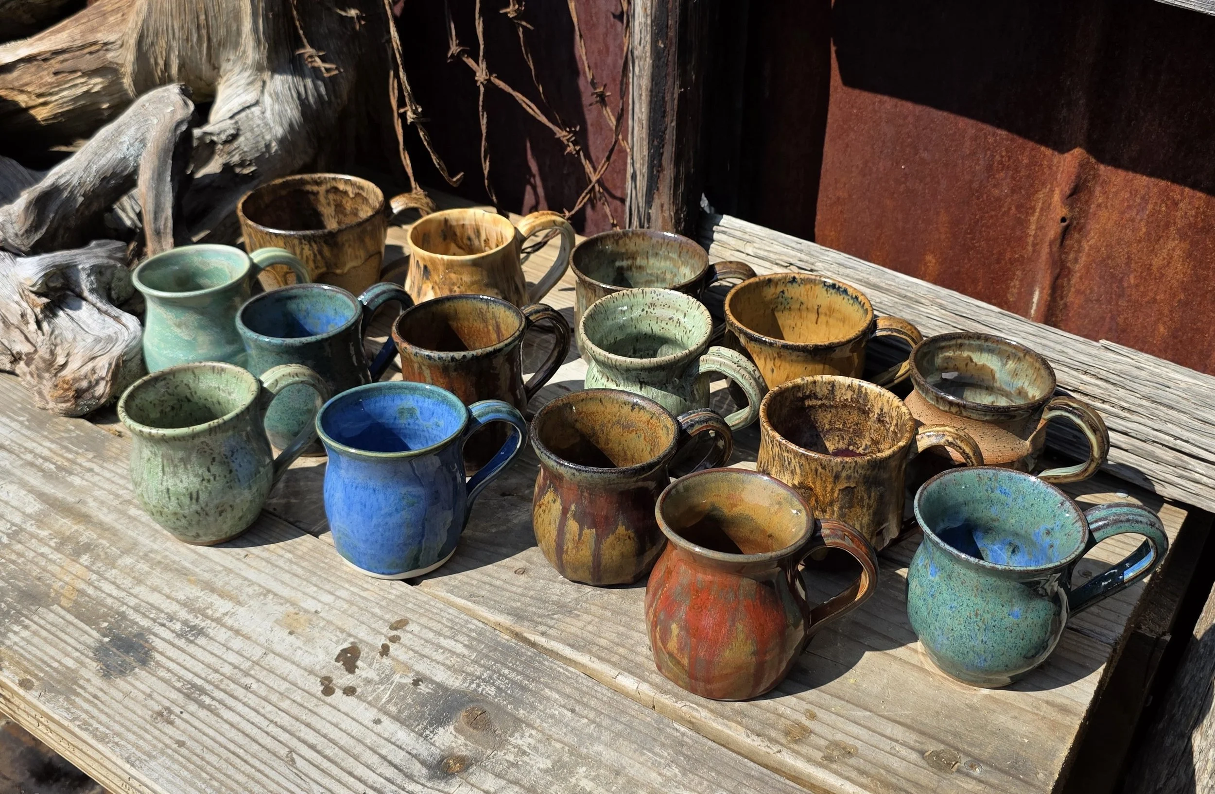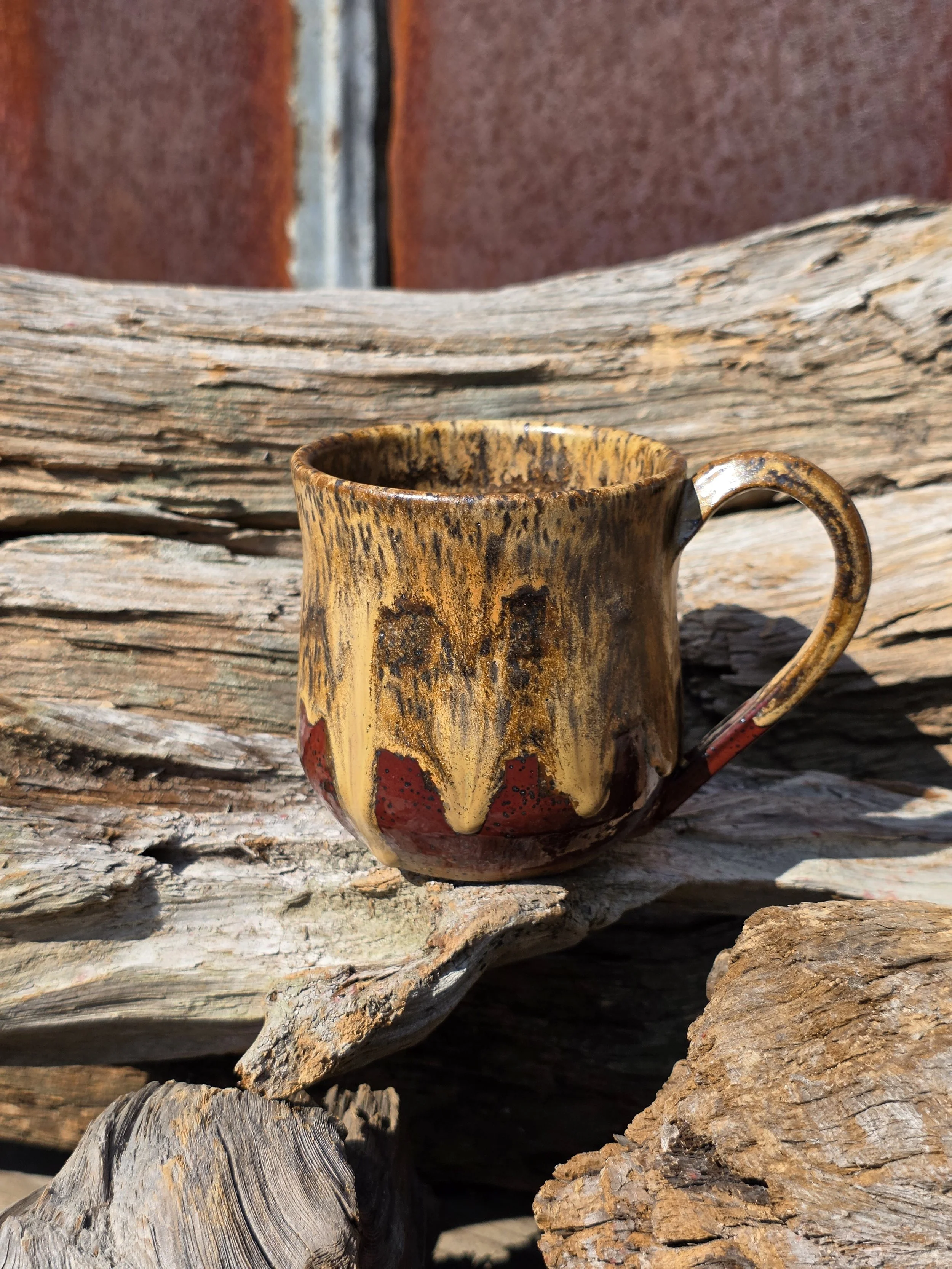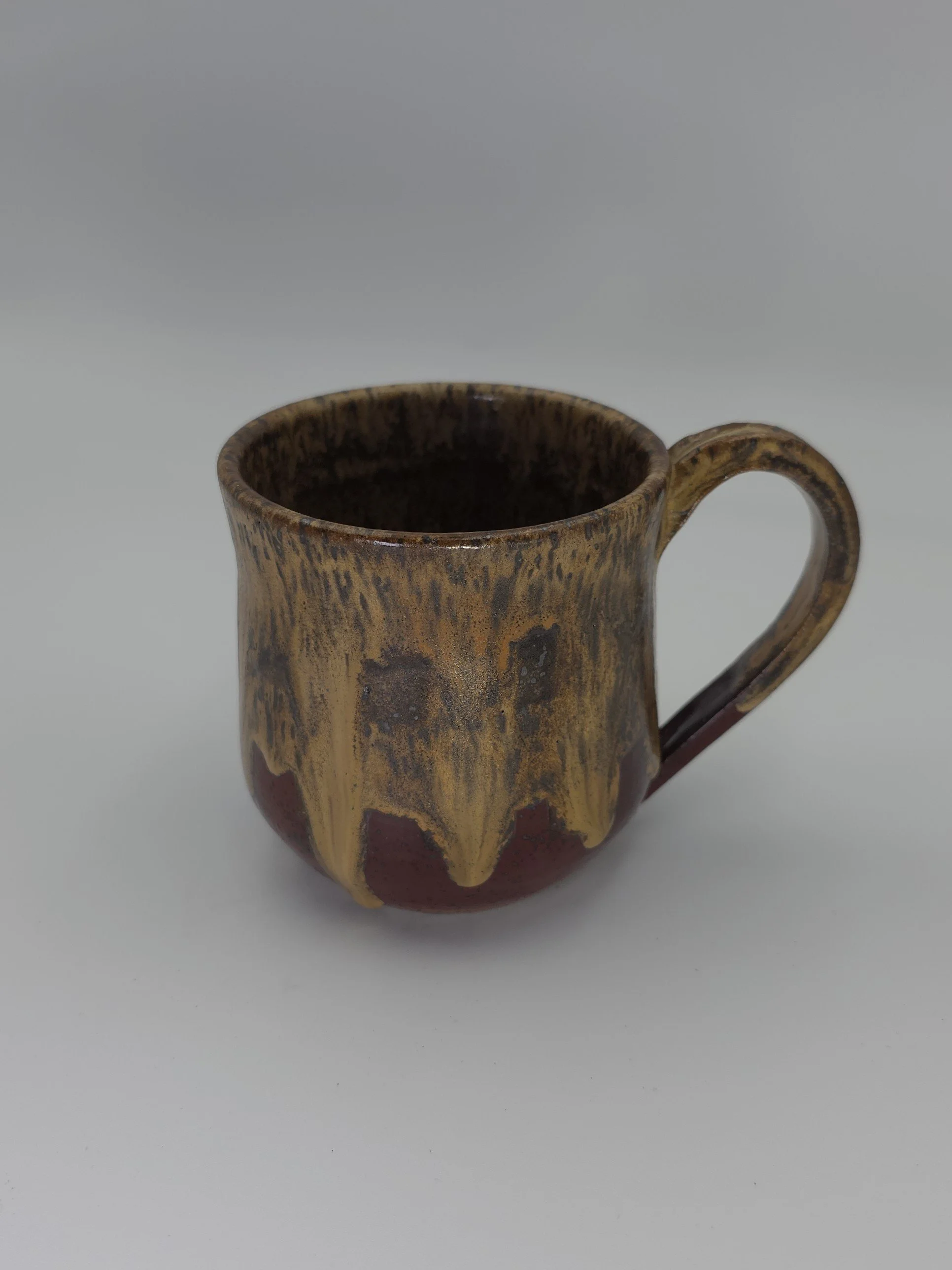 Birch and cordovan combine to create caramel runs on speckled clay. Holds approximately 13 ounces. 3.75 inches tall and 3.25 inches inside diameter at the rim. Microwave and food-safe.