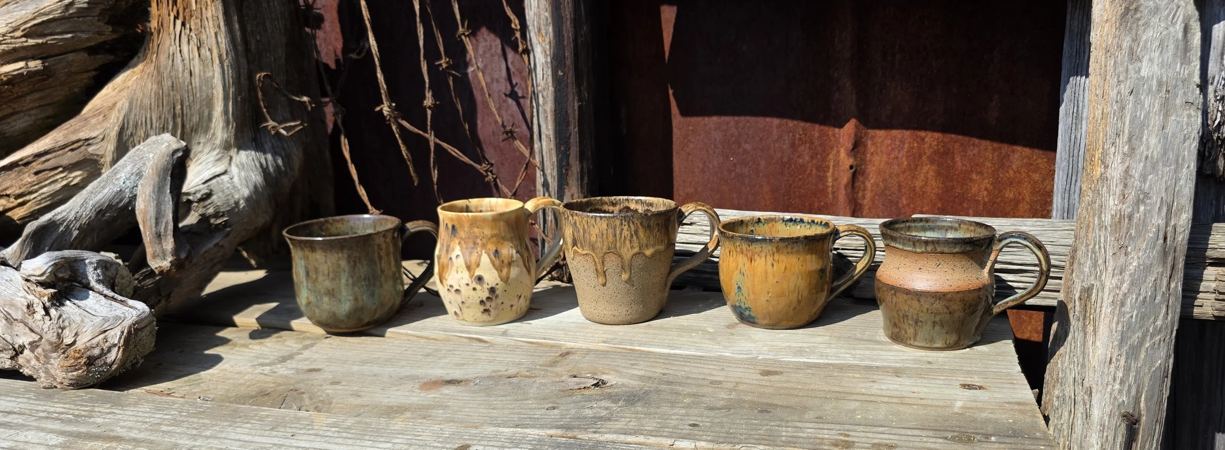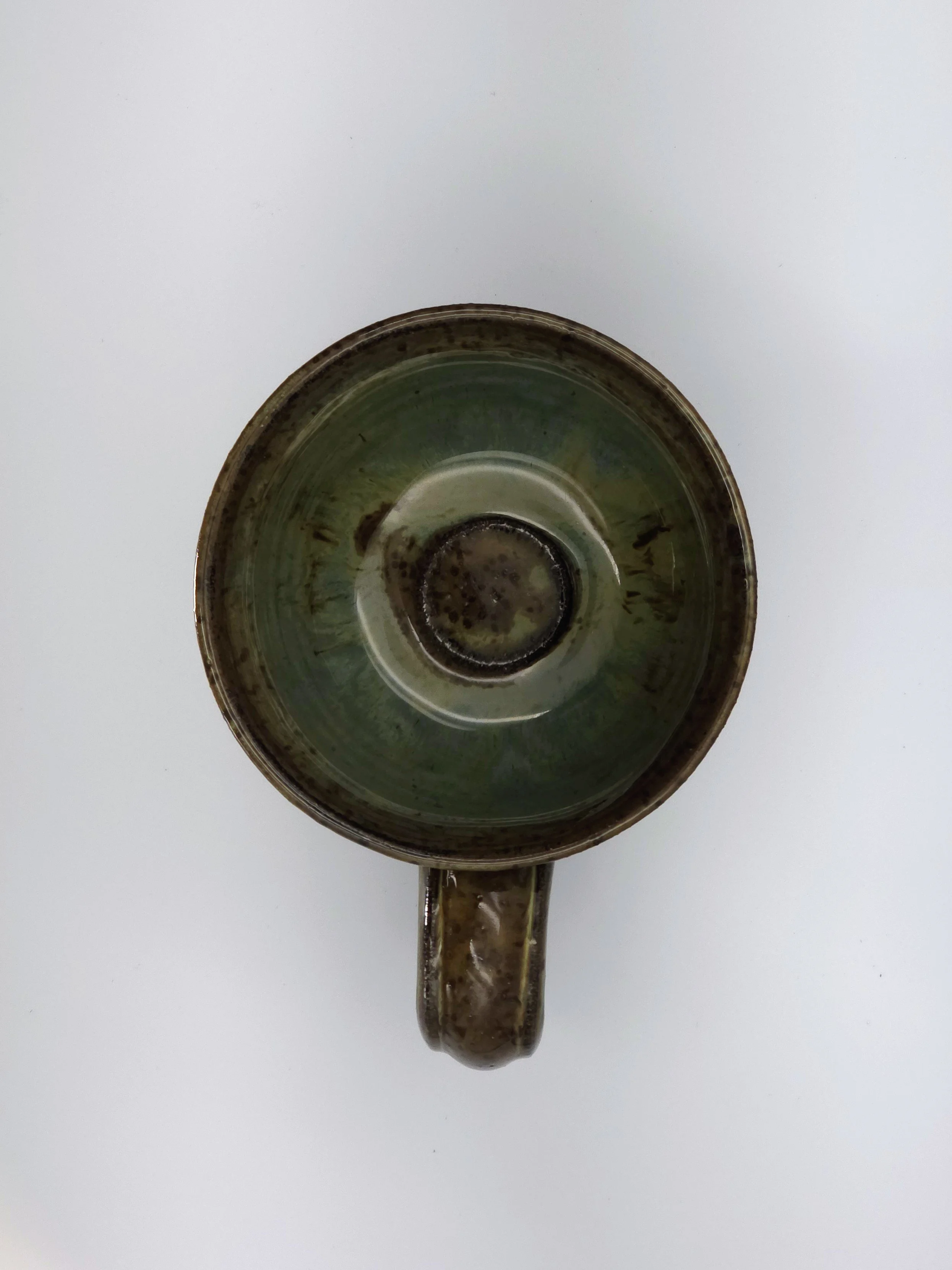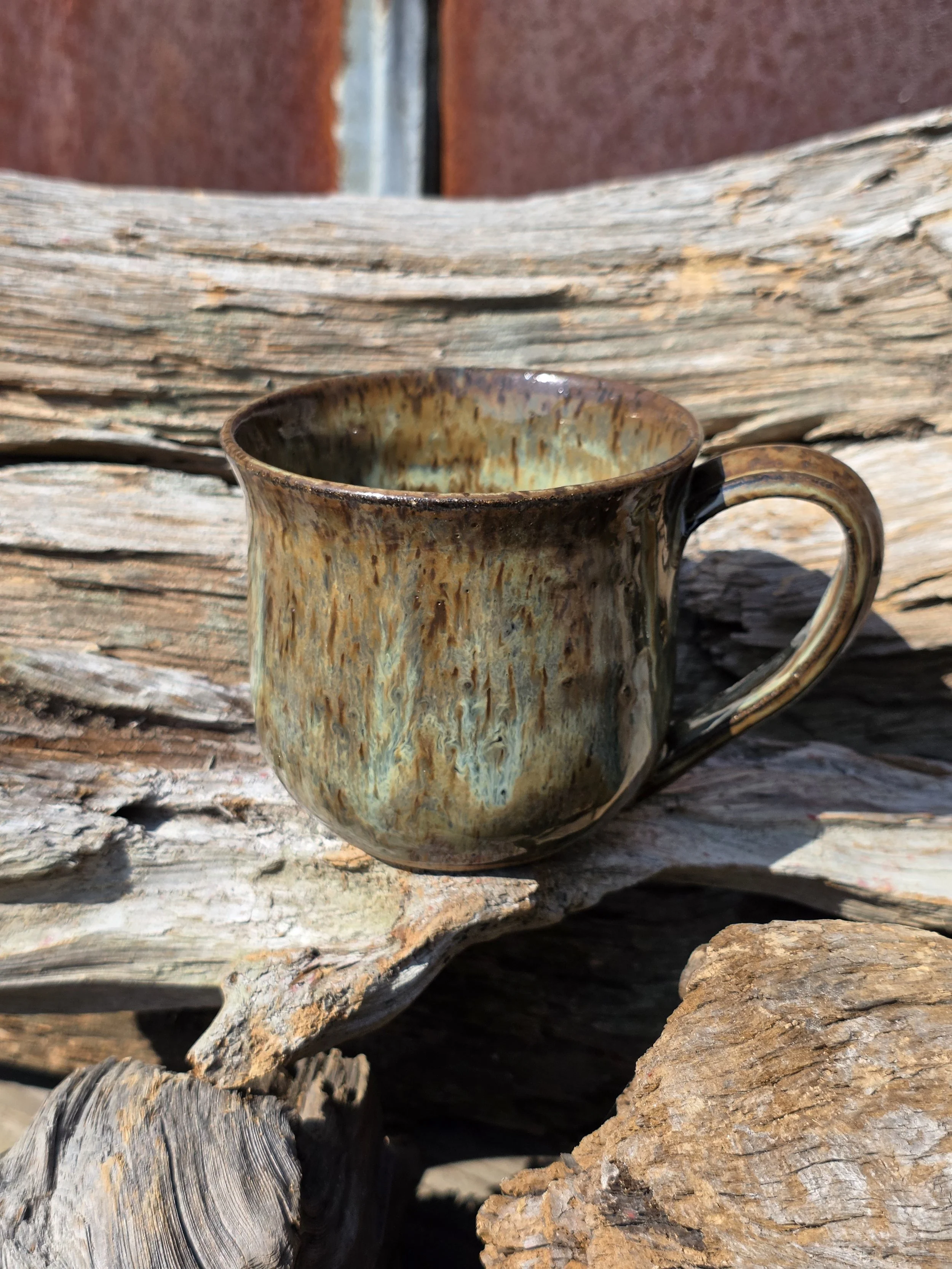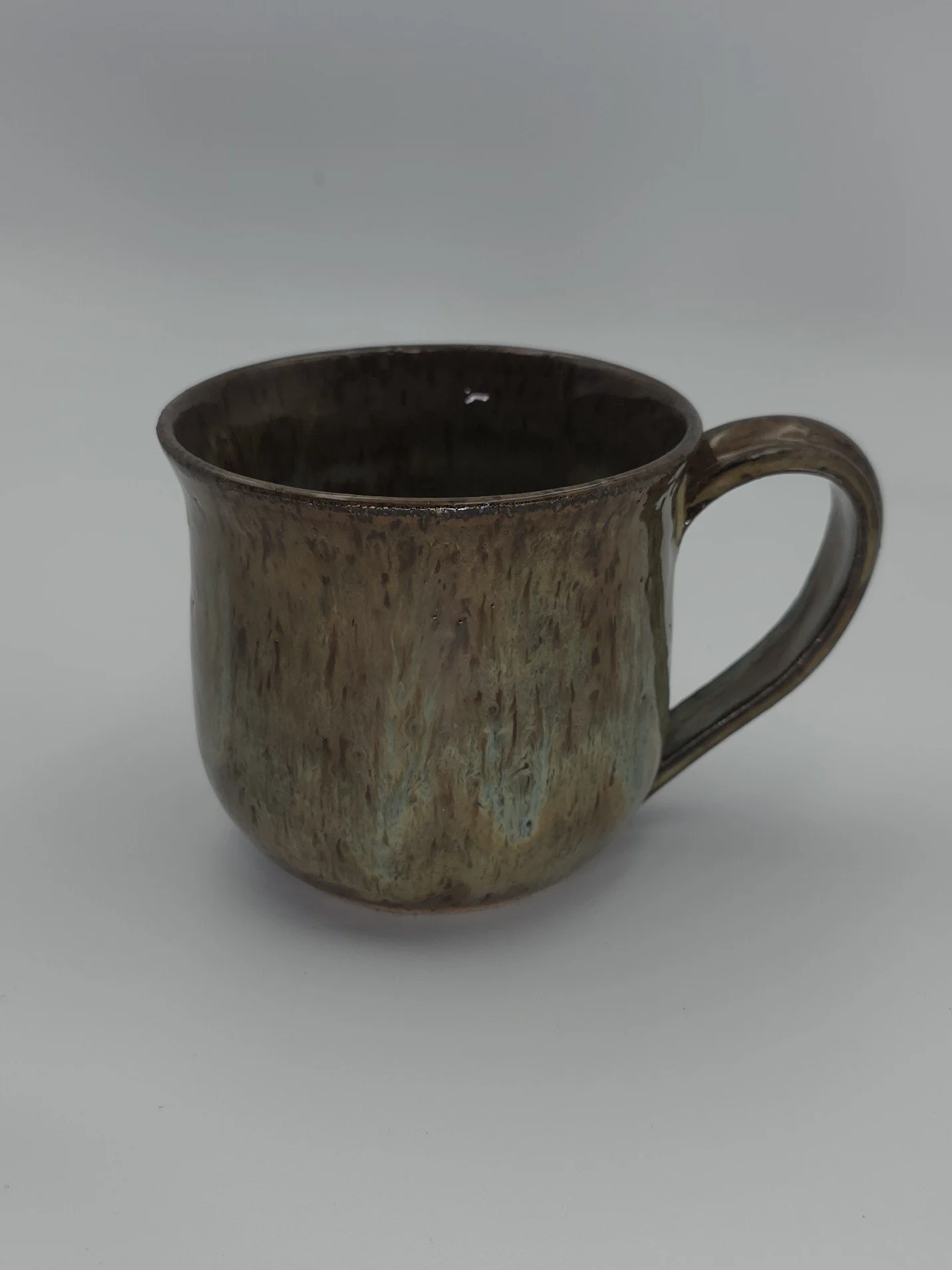 Large mug on speckled clay with a rich brown glaze and blue green runs. Holds approximately 15 ounces. 3.75 inches tall and 3.75 inches inside diameter at the rim. Microwave and food-safe.